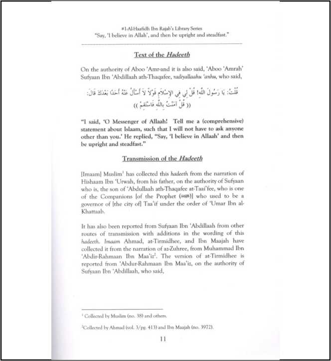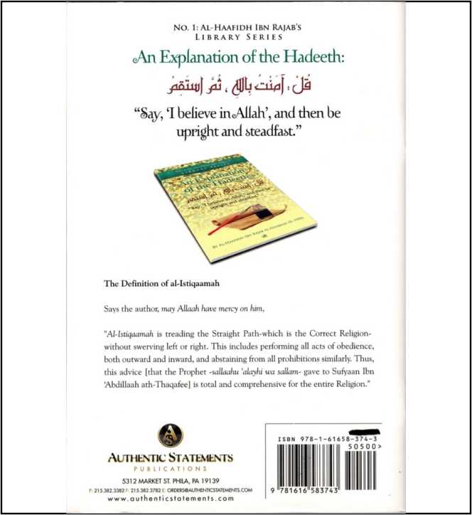 ” Al, Istiqaamah is treading the straight path-which is the correct religion without swerving left or right. This includes performing all acts of obedience, both outward and inward, and abstaining from all Prohibitions similarly.Thus this advice [that the prophet (sallallaahu alaihi wa sallam)gave to Sufyaan Ibn Abdillaah ath-thaqafee]is total and comprehensive for the entire religion.”