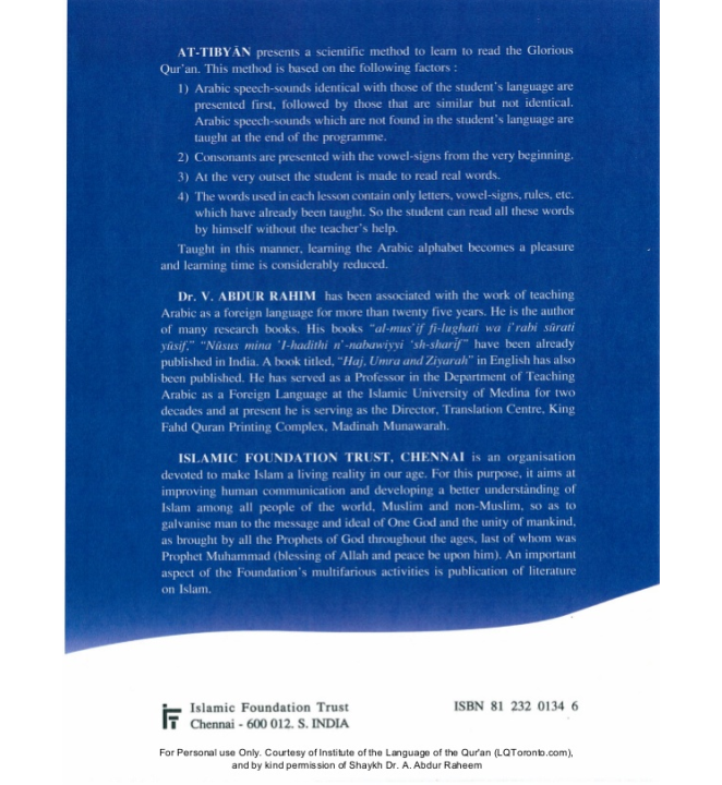 AT-TIBYAN presents a scientific method to learn to read the Glorious Quran. This method is based on the following factors: