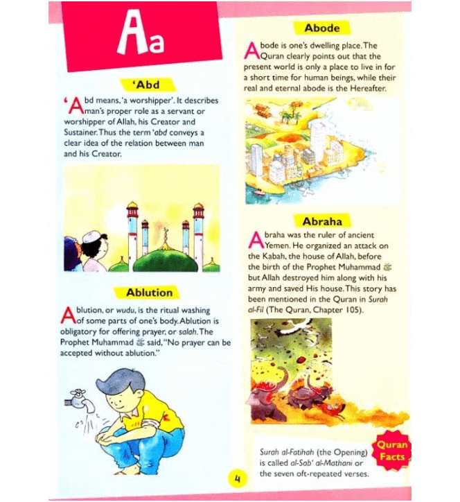 Goodword Quran Dictionary for Kids is an ideal first reference book for children who are curious to know about the Quran. Designed especially for children, this unique treasury of Quranic words guides them through over 350 essential names, terms and concepts mentioned in the Quran. Alphabetically arranged, words are clearly defined and are accompanied by charming illustrations and pictures that make it fun for children to find the words and understand them. Beside this, Goodword Quran Dictionary for Kids includes prayers from the Quran with references and their translation and Quran facts to help children learn the message and teachings of the Quran.