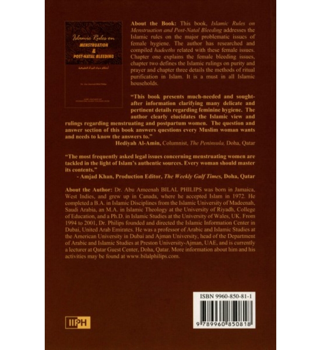 Islamic Rules on Menstruation and Post-natal Bleeding presents the legal verdicts regarding the major and sometimes problematic issues regarding ritual purity, impurity, personal hygiene and the female reproductive cycle. Dr. Bilal Philips has researched and compiled a body of hadiths that relate directly to this topic. A lengthy chapter is devoted to the rulings of the eminent scholar of jurisprudence Shaykh Ibn al-‘Uthaymeen, much of whose writings on this topic are well known to Arabic speakers, and are here available in English in one comprehensive volume.