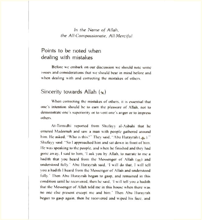 There are many teaching methods with different means and aids. Correcting mistakes is one that educationalists call the ‘remedial method’. Correcting people’s mistakes is essential if teaching people is the aim. Correcting mistakes is a divine method the Prophet (blessings and peace be upon him) practiced, as some verses of the Qur’an were revealed to correct certain mistakes made by his eminent Companions. The Prophet (peace be upon him) was divinely guided in correcting people’s mistakes, so his methods are the best of all. Following the example of the Prophet (peace be upon him) is therefore the best approach if one is really keen to teach Islamic knowledge and any of the other branches of knowledge. Shaykh Muhammad Sâlih al-Munajjid describes with clear examples from the Sunnah the various methods of the Prophet for teaching people and correcting their mistakes. This book is indispensable for everyone concerned with education in general and Islamic knowledge in particular. It is an excellent reference in educational methodology.