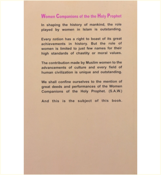 In shaping the history of mankind, the role played by women in Islam is outstanding. The contribution made by Muslim women to the advancements of culture and every field of human civilization is unique and outstanding. Hence, the subject of this book is the great deeds and performances of the Women companions of the Holy Prophet (PBUH) including Daughters and Wives of the Holy Prophet (PBUH). This book is a product of Islamic Book Service Pvt Ltd, which focuses on publishing Islamic Books under the light of Quran and Hadeeth (Hadees).